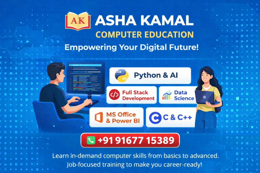 Asha Kamal Computer Education is committed to empowering students with practical and industry-ready computer skills. We offer comprehensive training in Python programming, Artificial Intelligence & Data Science, Machine Learning, Full Stack Development, MS Office (Expert Level), Power BI, Tableau, C, and C++.